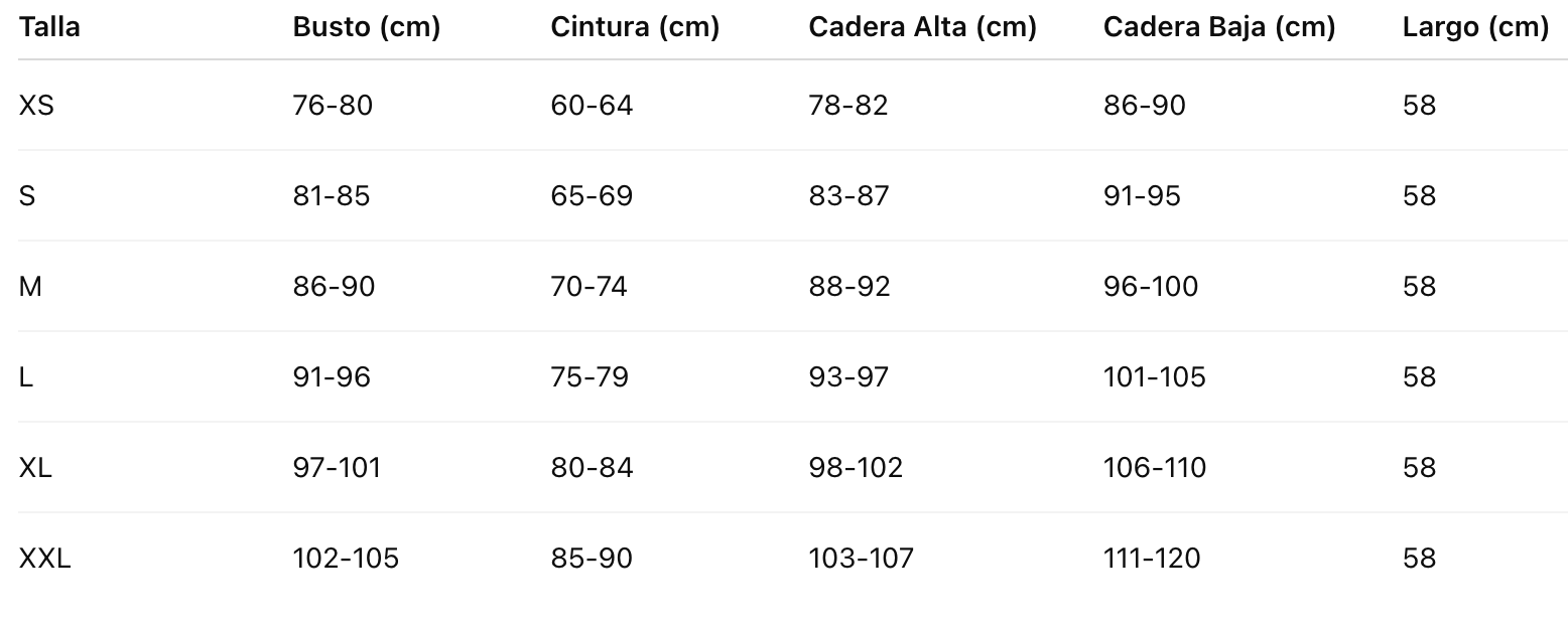 Talla Busto (cm) Cintura (cm) Cadera Alta (cm) Cadera Baja (cm) Largo (cm)
