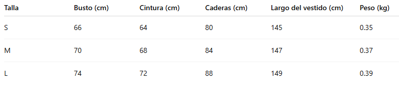 Talla Busto (cm) Cintura (cm) Caderas (cm) Largo del vestido (cm) Peso (kg)