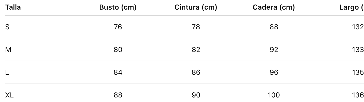 Talla Busto (cm) Cintura (cm) Cadera (cm) Largo (cm)