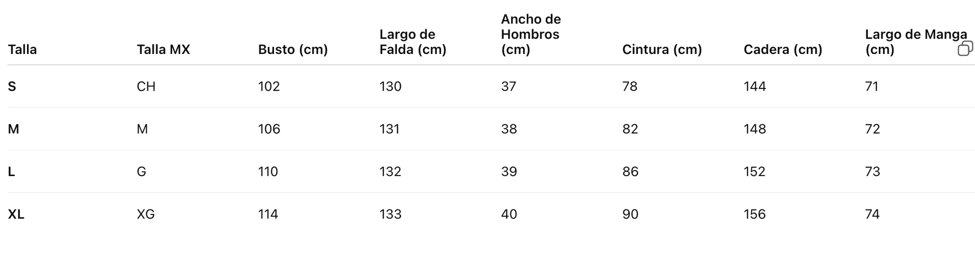 Talla Talla MX Busto (cm) Largo de Falda (cm) Ancho de Hombros (cm) Cintura (cm) Cadera (cm) Largo de Manga (cm)