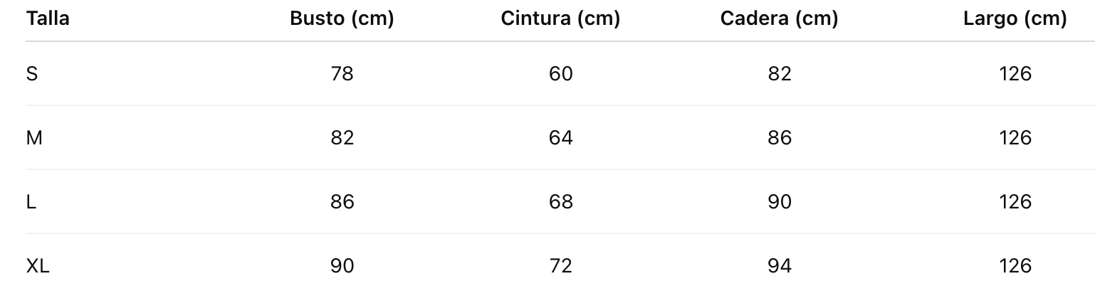 Talla Busto (cm) Cintura (cm) Cadera (cm) Largo (cm)