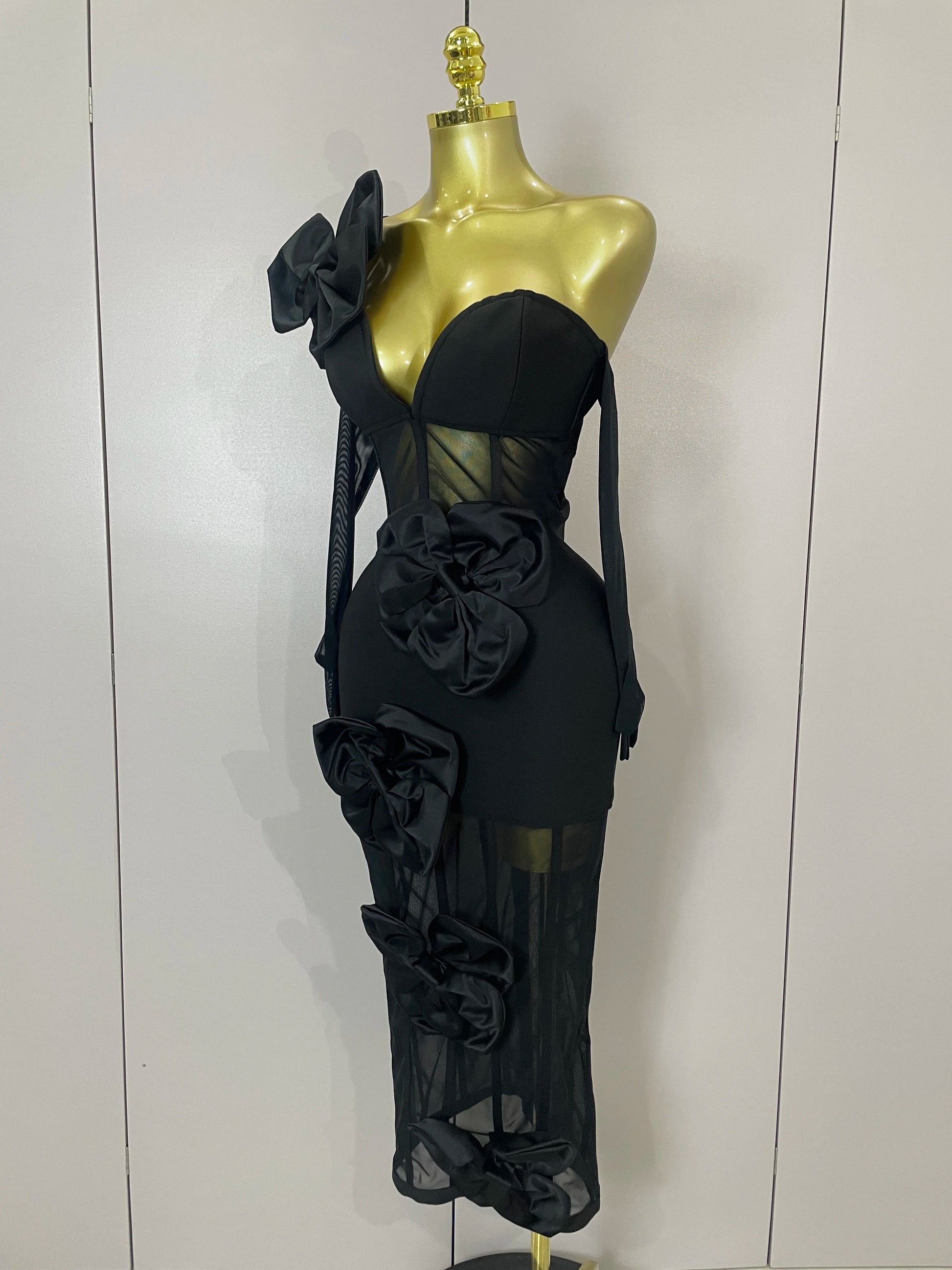 ✨ Este deslumbrante vestido negro combina sensualidad, arte y elegancia de alta costura. Su silueta ajustada, el tul transparente y las flores satinadas crean un look dramático y sofisticado que roba miradas al instante. Perfecto para mujeres que desean brillar con un estilo único y lleno de lujo en cualquier ocasión especial.