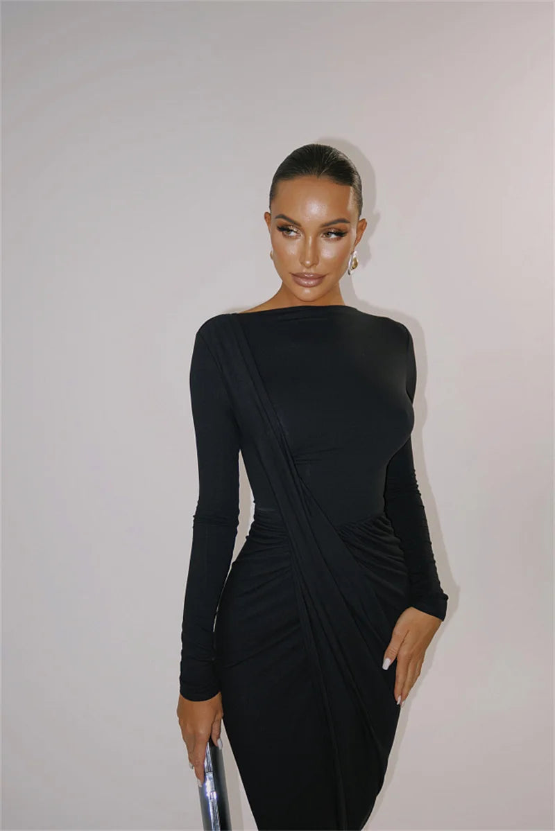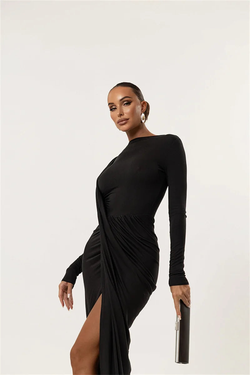 ✨ Este elegante vestido largo con abertura alta combina sensualidad y sofisticación en un diseño que realza la silueta femenina. Su corte ajustado con drapeado lateral y mangas largas aporta un toque glamuroso, perfecto para fiestas, cenas o eventos donde quieras destacar con estilo y confianza. 💃💫