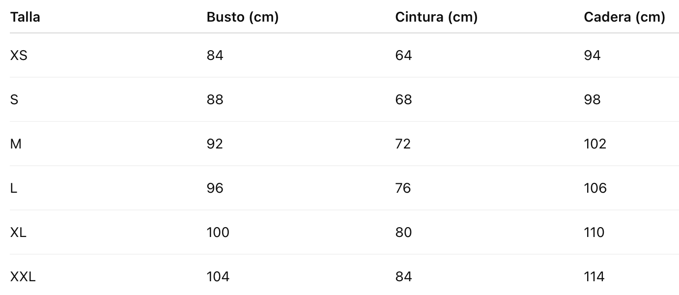 Talla Busto (cm) Cintura (cm) Cadera (cm)
